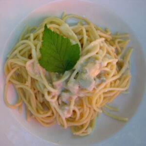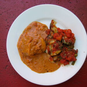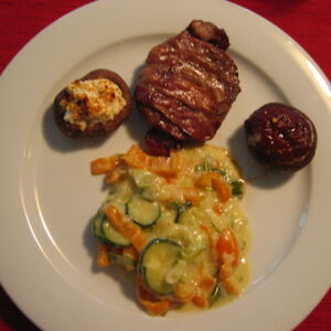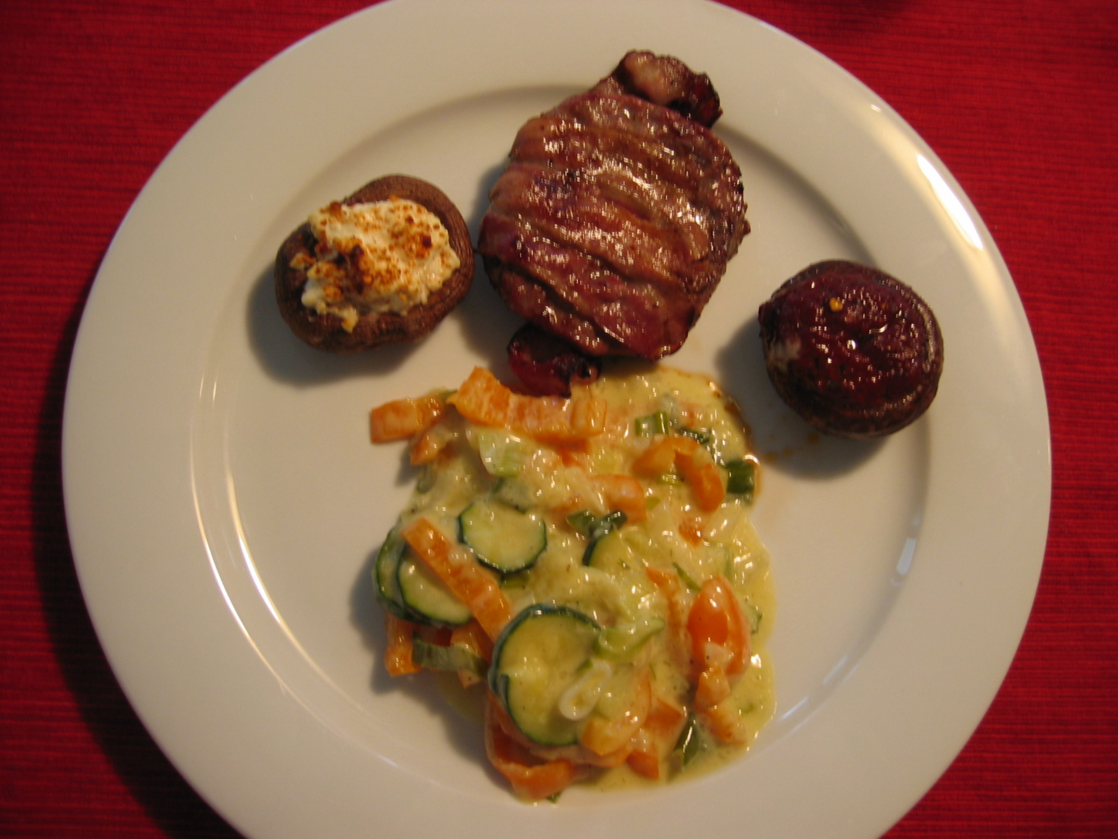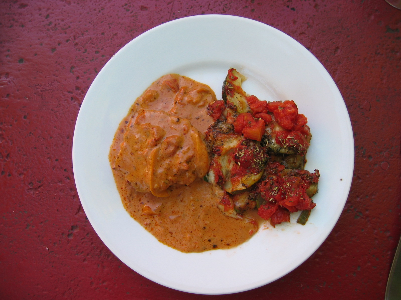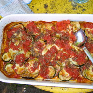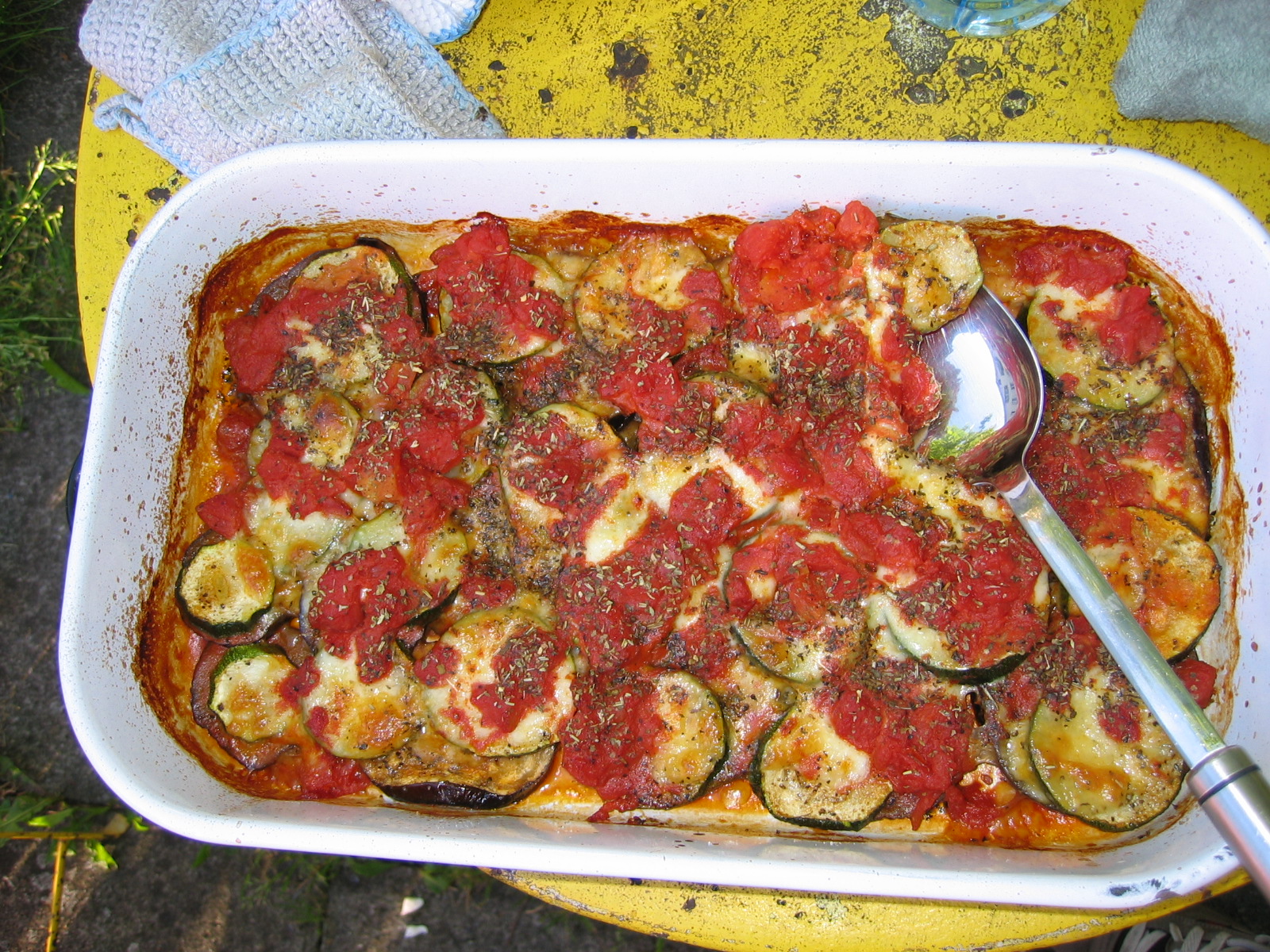 mediumpikante Saftplätzli Auberginen-Zucchetti-Mozza-Auflauf