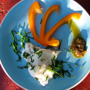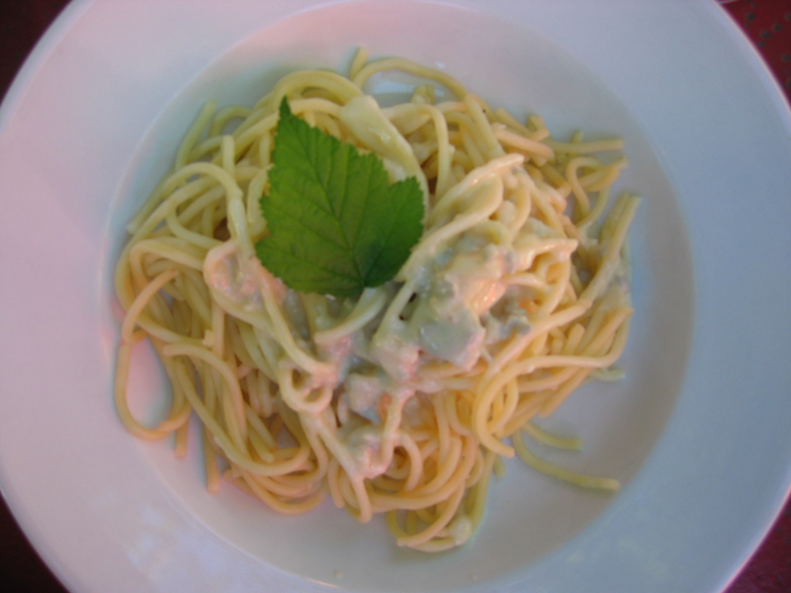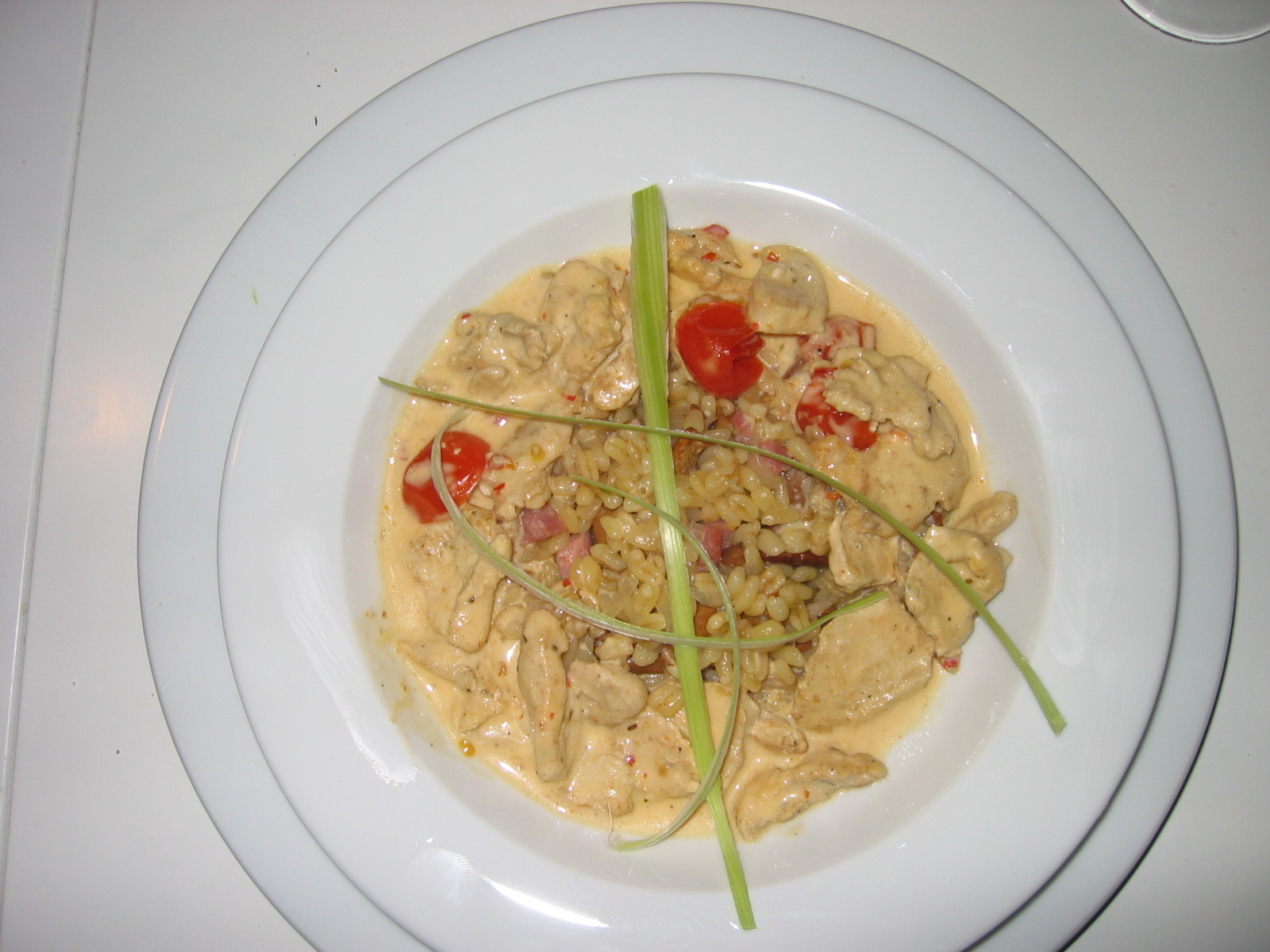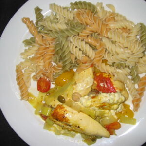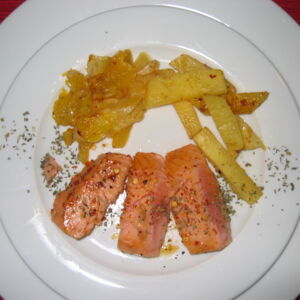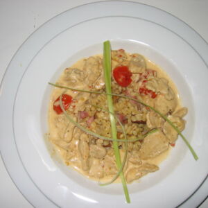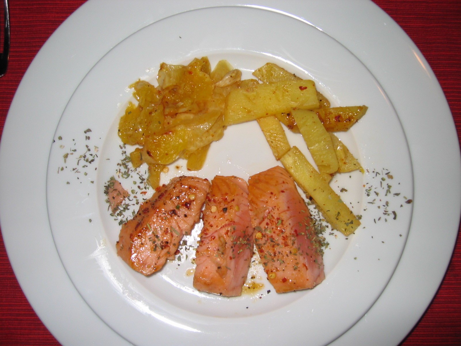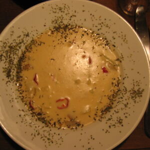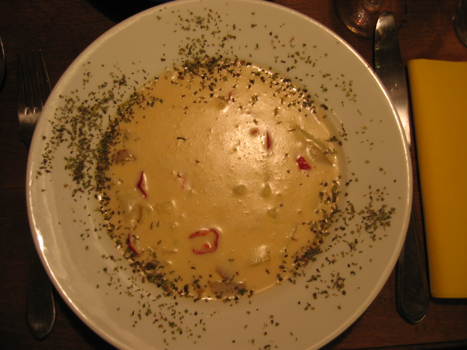 Kokosgemüsesuppe mit Lachsfiletstreifen