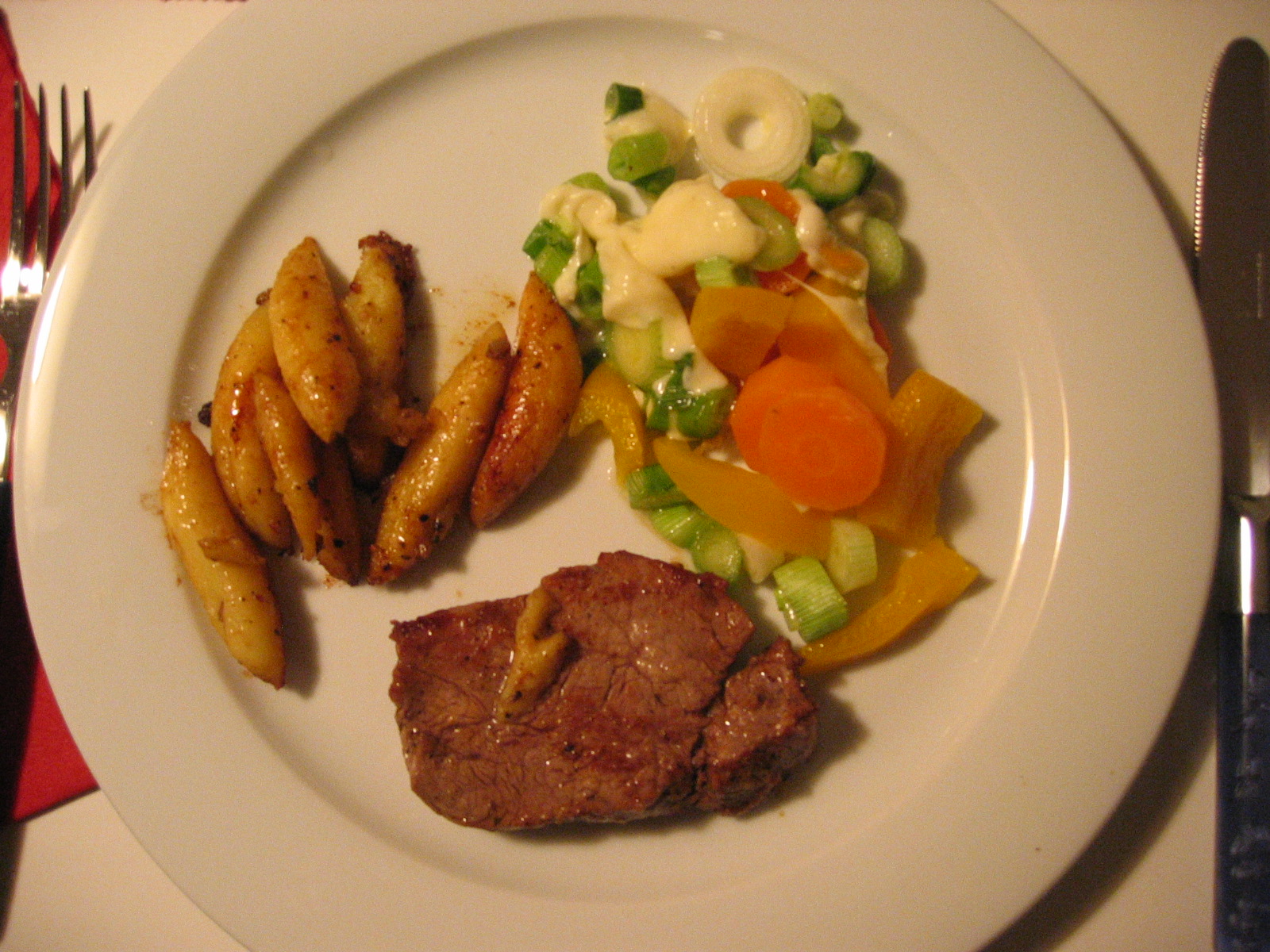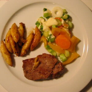 feine Kalbsfiletstücke mit Schlupfis und Gemüse