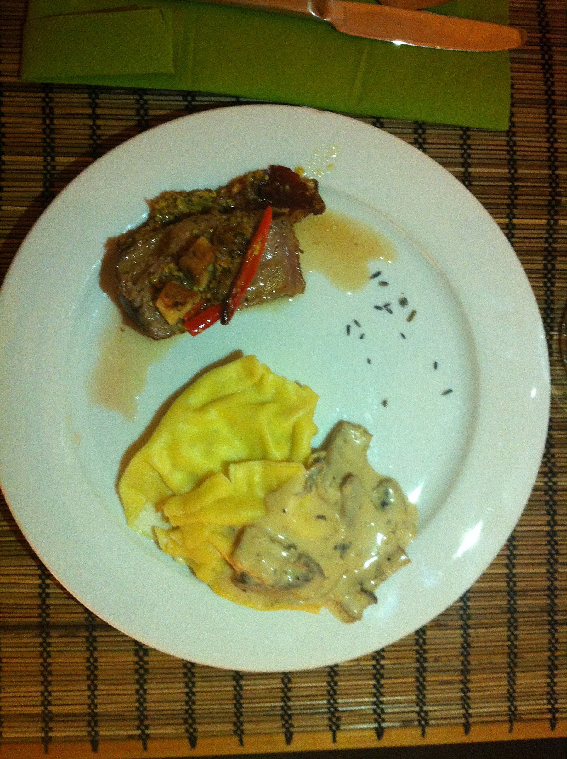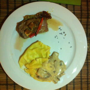 Champignons-Borsin-Ravilio mit lecker Sahne-Sauce und totem Tier