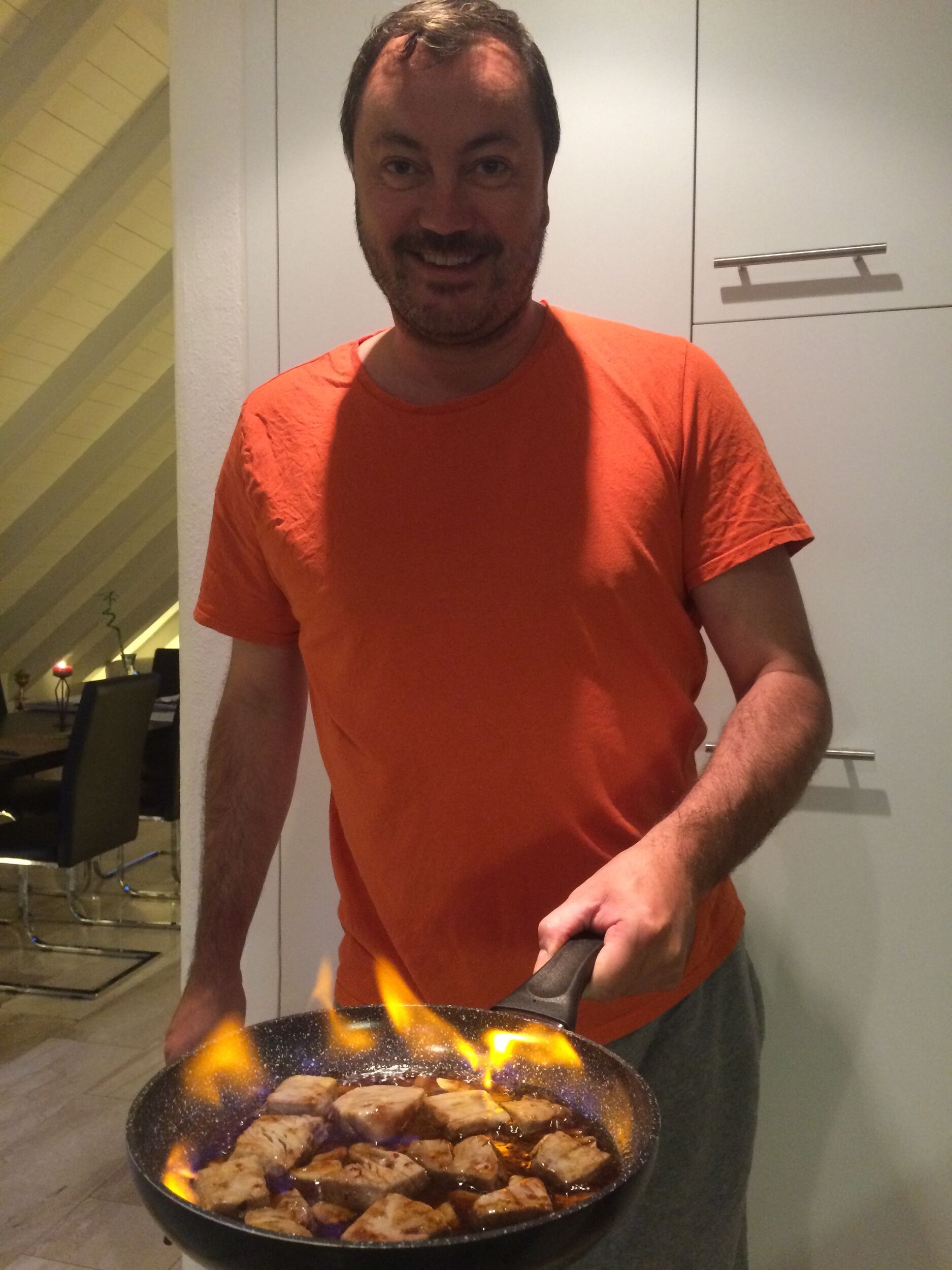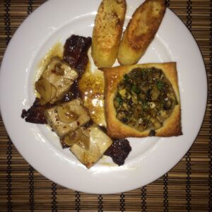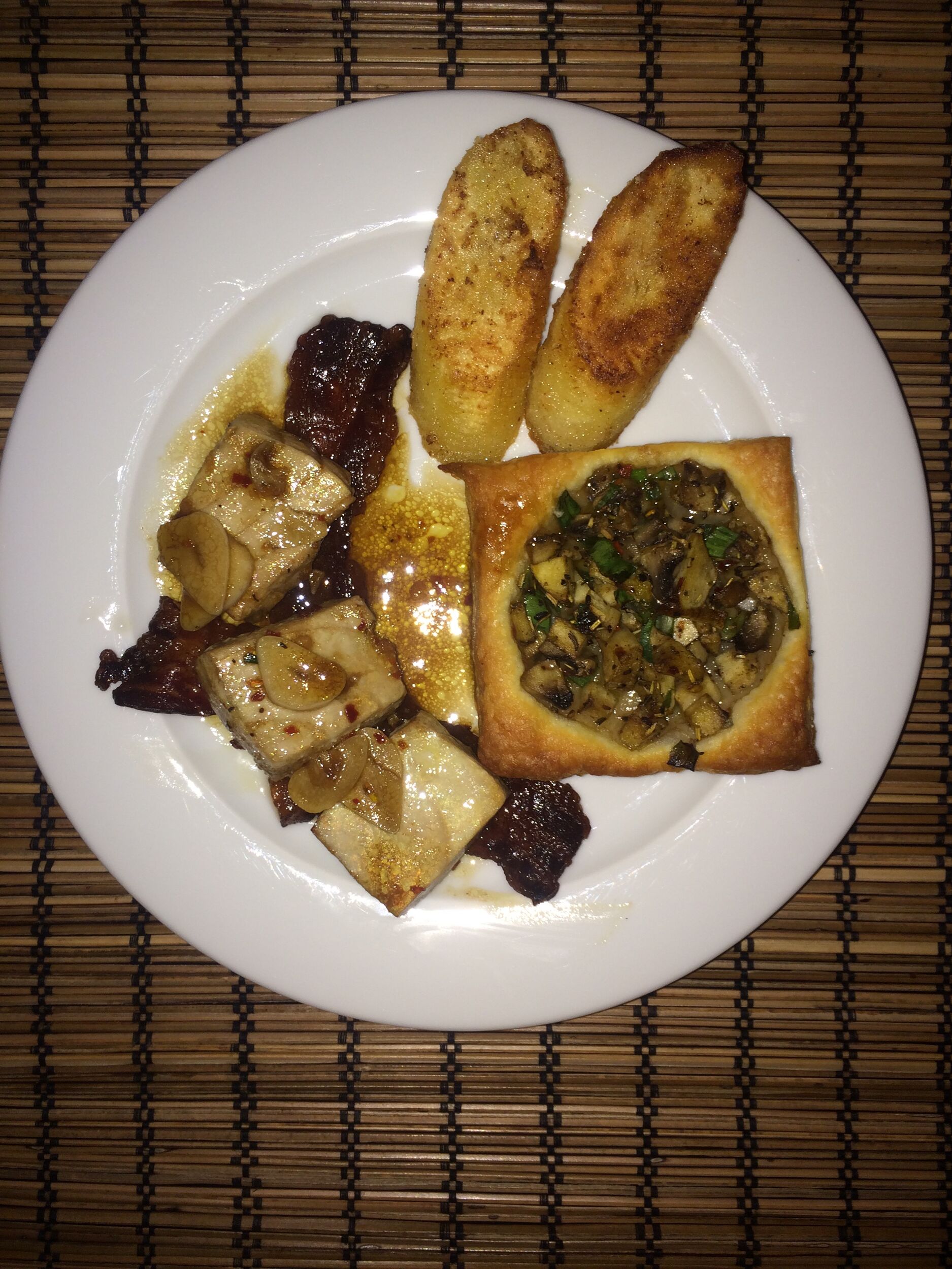 flambierter Thunfisch mit Pilzecken und fritierten Bananen